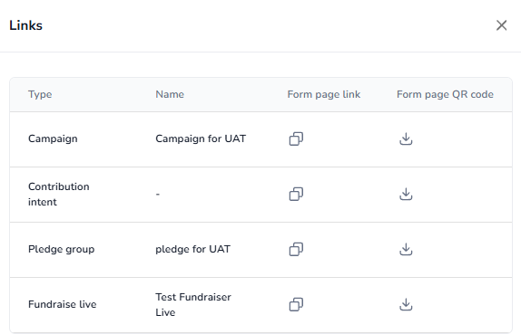 A contribution intent link and QR codes are automatically generated for each fundraiser page, enabling fast donor access during live events.