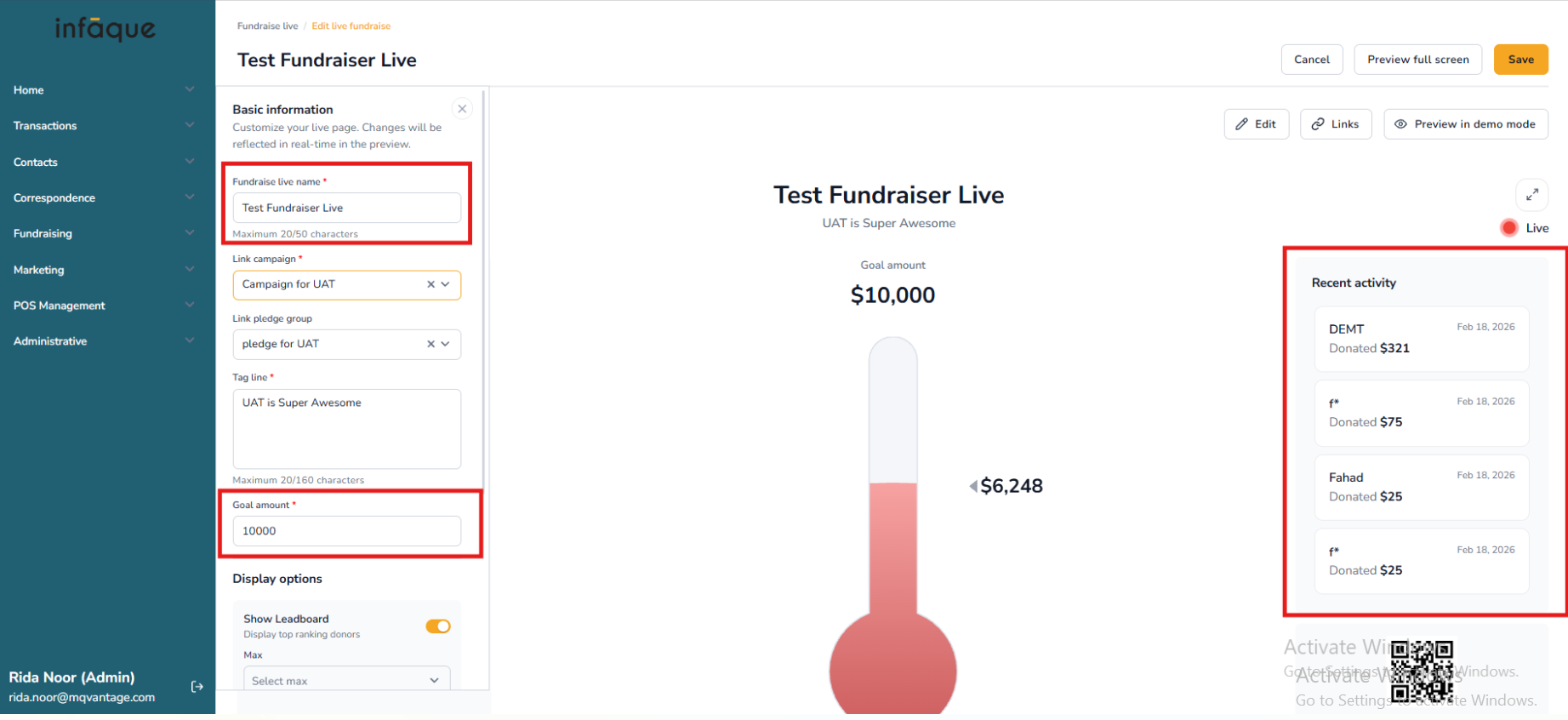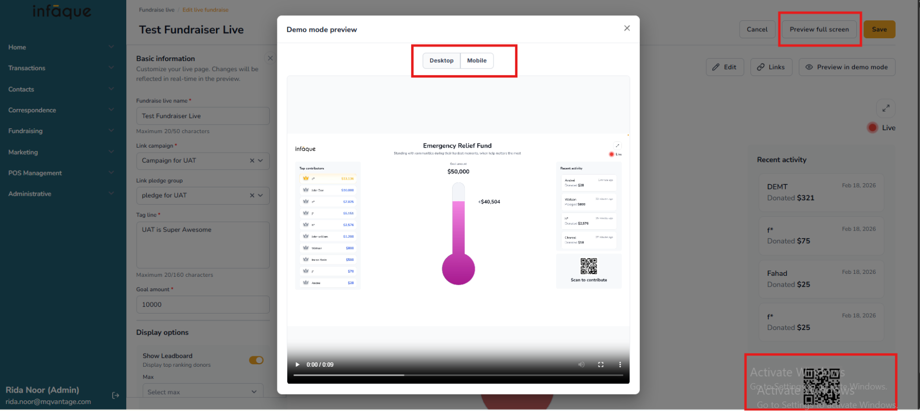Admins now have full control to customize live fundraisers, including donation settings, contribution tracking, and leaderboard visibility. Before launch, admins can preview the fundraiser on desktop and mobile to ensure an optimized experience.